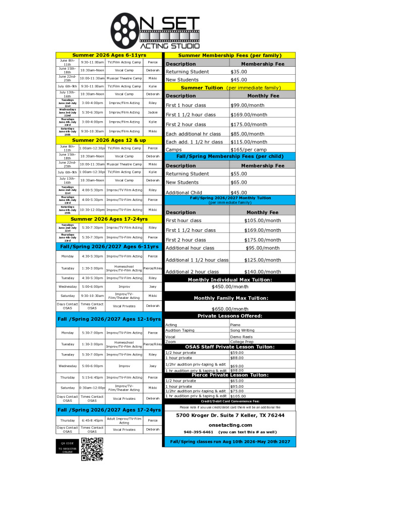 We love On Set Acting! My son has been taking classes from Pierce for several years and has thrived! I highly recommend On Set Acting.